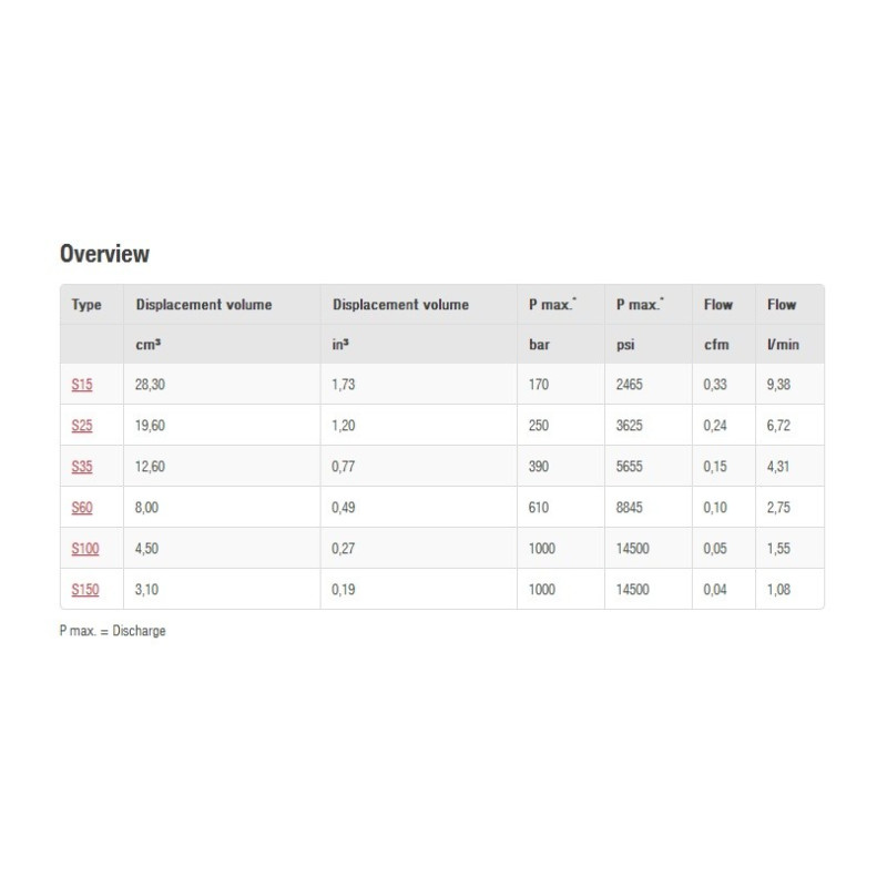 Die S-Pumpen in einstufiger, einfachwirkender Ausführung zeichnen sich durch ihre leichte und kompakte Bauweise aus und sind daher sowohl für Aggregate im stationären Betrieb als auch für den mobilen Einsatz geeignet. Die Pumpen laufen durch kaum vorhandene geringe innere Reibung bereits bei einem Luftantriebsdruck von nur 1 bar (14,5 psi) an und sind ideal für Anwendungen, bei denen schnelle Reaktionszeiten gefragt sind.