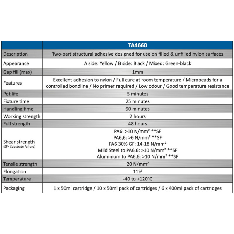 TA4660 is ideal for bonding Aluminium, Glass filled nylon, Nylon 6, Nylon 6.6, Mild steel and many more.