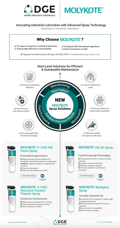 In environments where machinery efficiency and reliability are vital, effective industrial lubrication plays a key role in reducing friction, preventing wear, and maintaining operational performance. MOLYKOTE® continues to support these demands with its trusted spray products, now featuring a new multi-position foldable nozzle. This simple yet practical enhancement enables more precise application, improved ease of use, and broader surface coverage, helping maintenance teams work more efficiently.