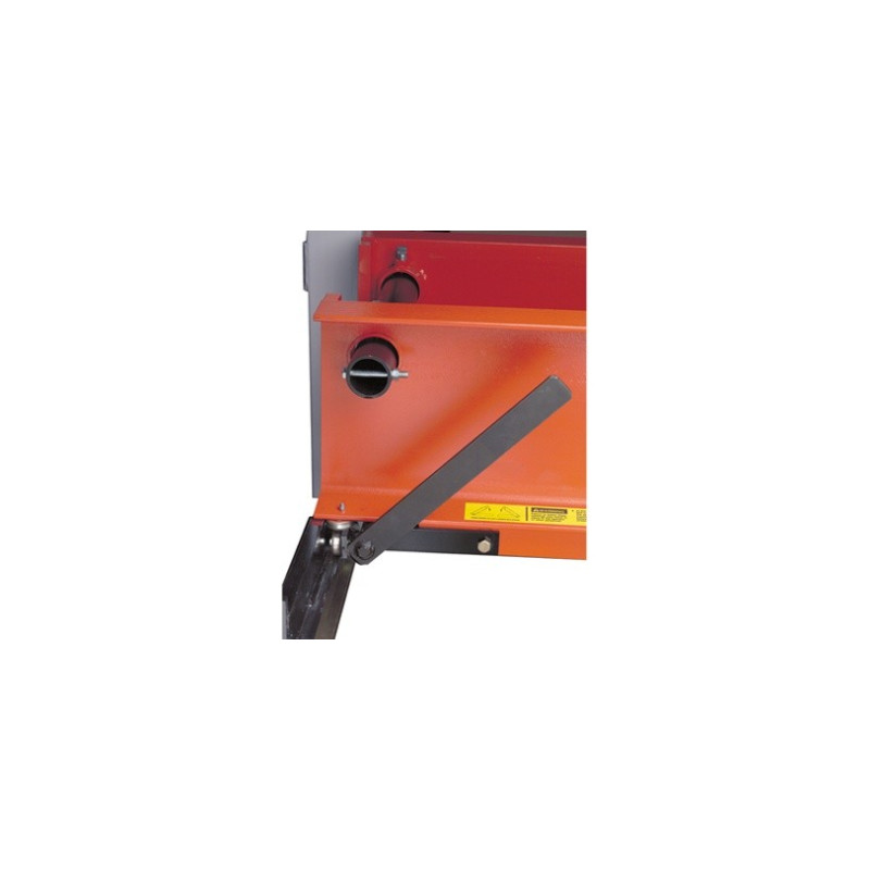 - Hubvorrichtung – Der obere Pressenträger kann durch Drehen der Kurbel in der Höhe verstellt werden. Ein Spindelmechanismus bewegt beide Seiten gleichmäßig nach oben und unten (für eine automatische Verstellung kann die Kurbel durch einen Kraftschrauber (12,7 mm) ersetzt werden). Vier Arretierungsbolzen halten den Pressenträger in der gewünschten Arbeitsstellung.