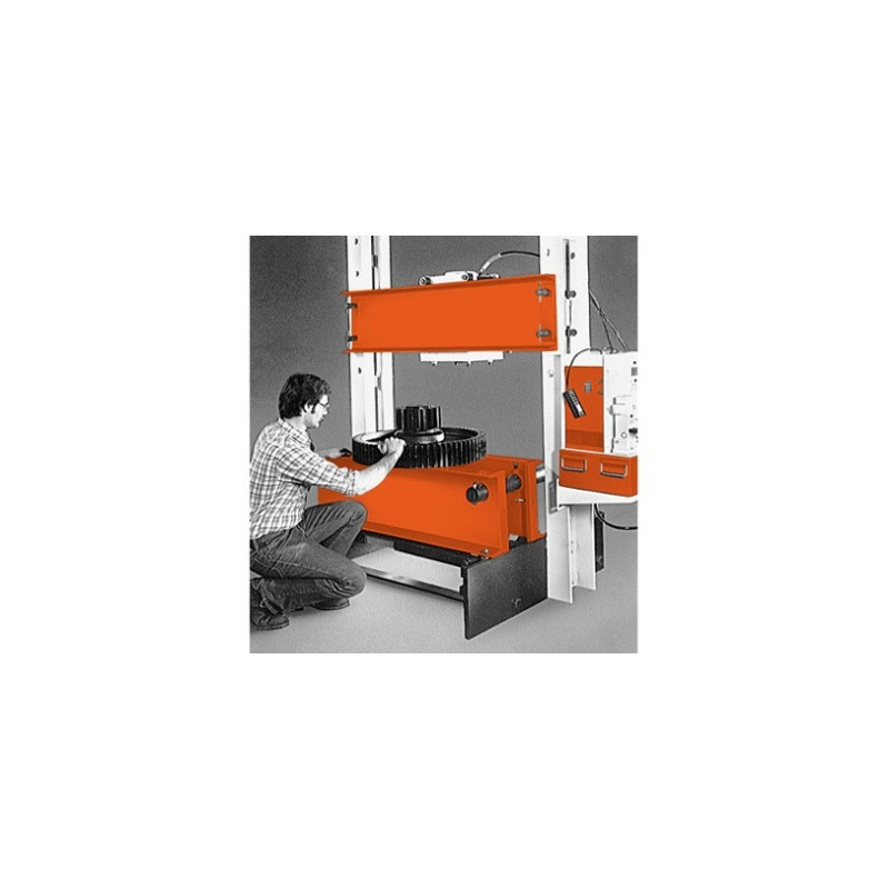 - Die patentierte Original-Rollbettpresse. Mit ausrollbarem Pressenbett für einfaches Einführen und Entnehmen von Werkstücken mit einem Kran oder einem anderen Hebewerkzeug.