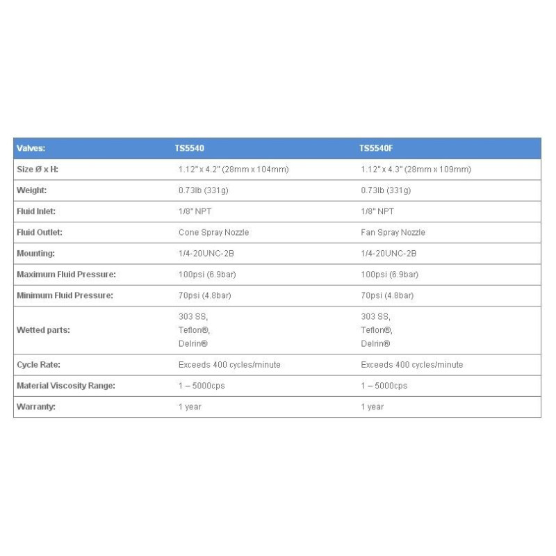 Sprühventil TS5540-MS wurde zum Versprühen nieder- bis mittelviskoser Fluide mittels Einweg-Dosierkartuschen entwickelt. Jenes innovative Design erlaubt es dem Ventil, einheitliche Sprühmuster mit Durchmessern von 4,6 mm bis 15 mm (0,180” bis 0,60”) zu erzeugen. Das Sprühventil TS5540-MS besitzt eine vor Ort austauschbare UHMWPE-Dichtung (Ultra-High-Molecular-Weight-PolyEthylene, Polyäthylen mit extra hohem Molekulargewicht), die ein sicheres Verschließen ermöglicht und die Lebensdauer des Ventils verlängert.