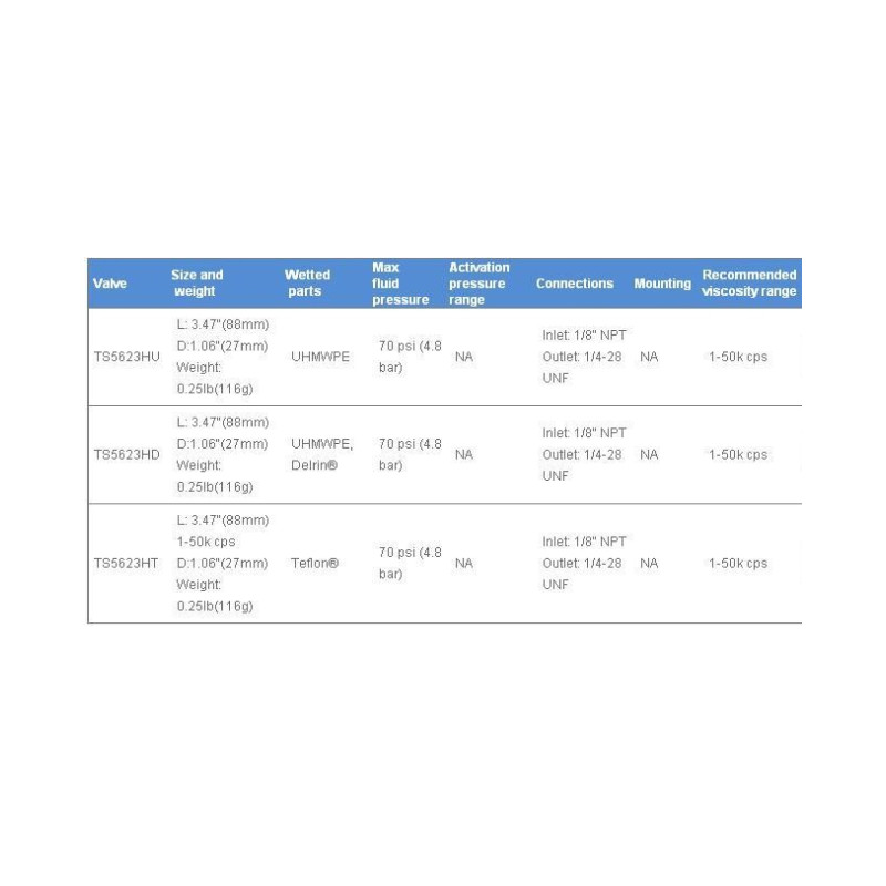 Die Membranventile sind für die Dosierung von nieder- bis mittelviskosen Medien ausgelegt und bieten bei verschiedensten Punkt- und Raupengrößen bis in den Mikroliterbereich optimales Dosierverhalten. Durch eine integrierte Rückstellfeder sind die Ventile mit den digitalen Timer- und Druckanzeige-Steuergeräten von Techcon Systems kompatibel. Ein kurzer Öffnungshub sorgt für ein extrem schnelles Schließen. Eine Rändelschraube zur Einstellung des Ventilhubs erleichtert die Feineinstellung der Dosierpunkte. Das kompakte Design erlaubt die flexible Adaption und den einfachen Einbau in automatisierten Linien.